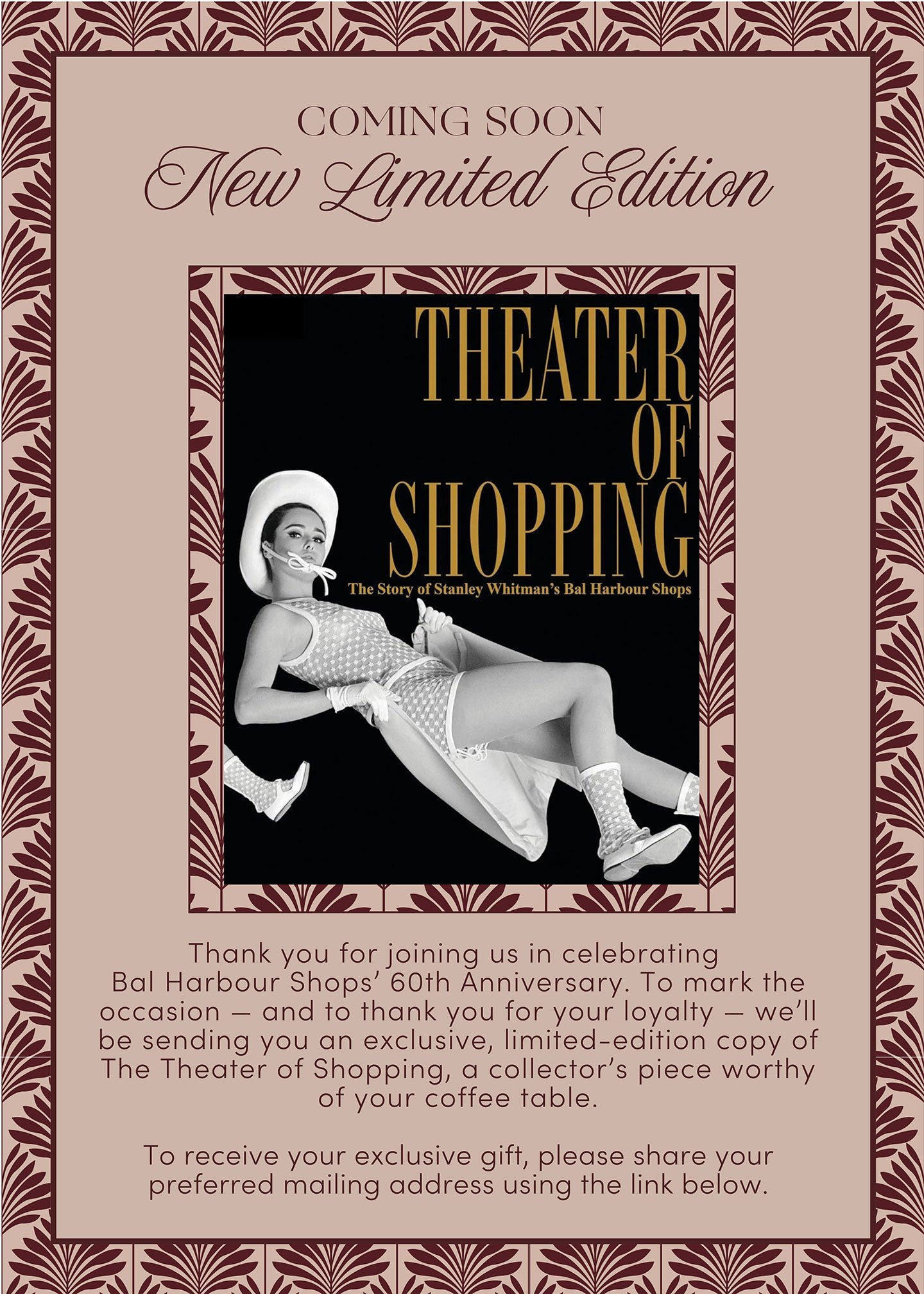 Thank you for joining us in celebrating Bal Harbour Shops’ 60th Anniversary. To mark the occasion — and to thank you for your loyalty — we’ll be sending you an exclusive, limited-edition copy of The Theater of Shopping, a collector’s piece worthy of your coffee table. Available early January 2026.