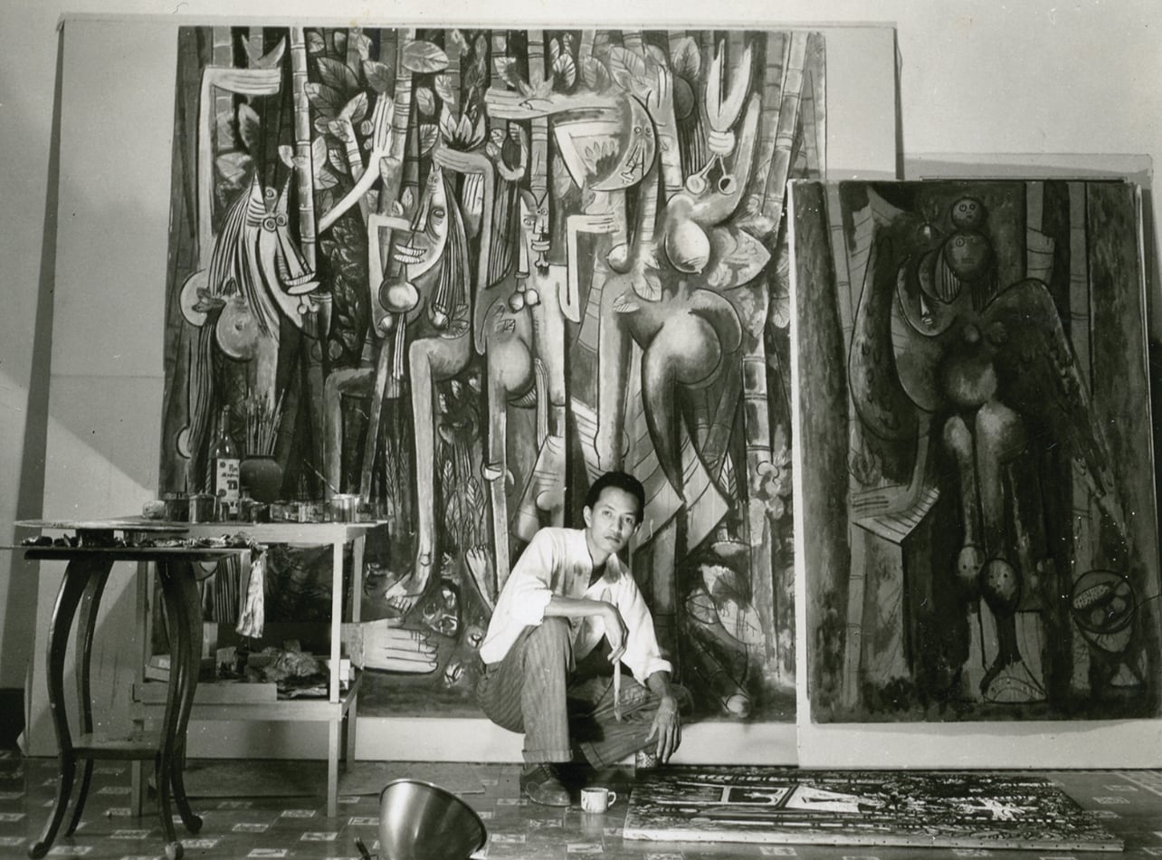 Wifredo Lam in his Havana studio, 1943, with La jungla (The Jungle), 1942–43, left; La mañana verde (The Green Morning), 1943, right; and on the floor, La silla (The Chair), 1943