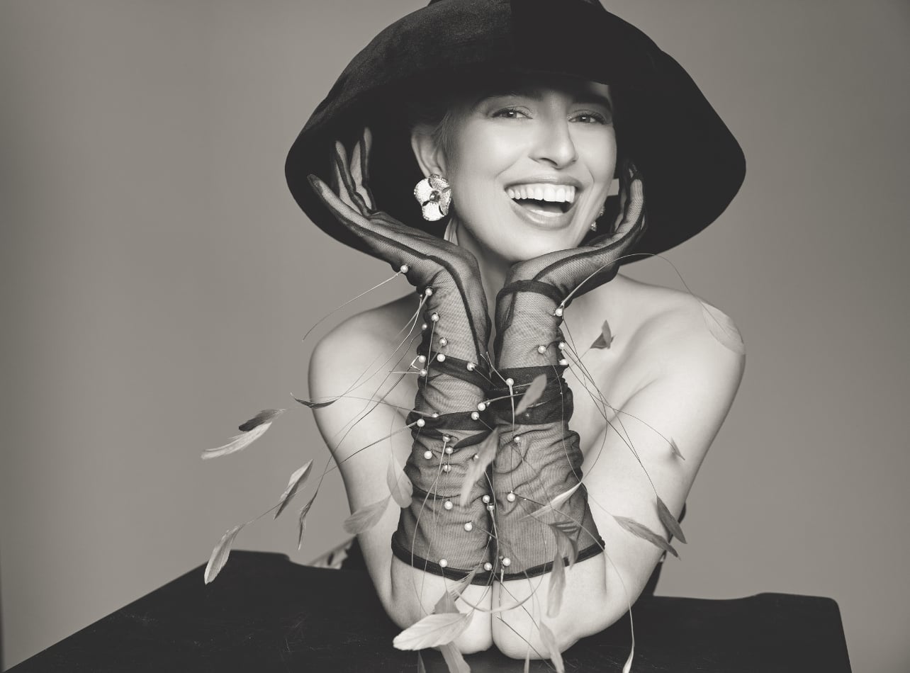 Karolina Kurkova wears a Carolina Herrera gown; Aquazzura Poème sandals, and a David Webb necklace, available at Yafa.