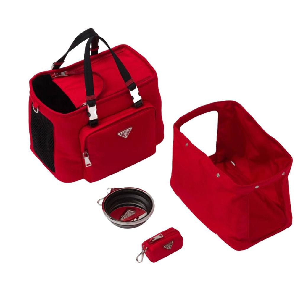 Red recycled nylon pet bag with detachable carrier, water bowl, and mini pouch